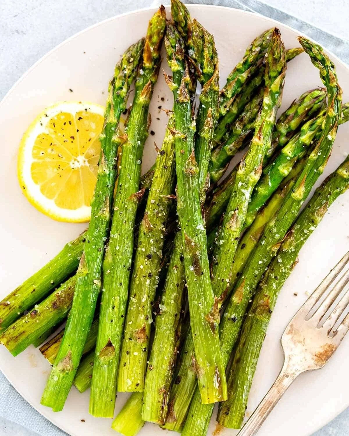 Add the asparagus and garlic, season with salt, and cook until the asparagus is knife-tender and bright green (about 3 minutes). Stir in the peas and cook until the peas are bright green (about 2 minutes).
